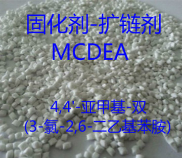 4,4'-亞甲基-雙(3-氯-2,6-二乙基苯胺),MCDEA與TDI預(yù)聚體有著良好地相容、配伍性,所制備的PU制品具有優(yōu)良的物理以及動態(tài)力學(xué)性能,在PU的澆注、噴涂、RIM等工藝技術(shù)方法都可使用;在PU的彈性體、微孔制品、膠粘劑、涂層劑等制品制備中,都有著廣泛地應(yīng)用,也可以用作環(huán)氧樹脂的固化劑以及供制備聚酰亞胺等所用.它與相應(yīng)的 MOCA、740M等混合使用,可以使PU彈性體性能得以提高,體現(xiàn)了良好地疊加作用。
