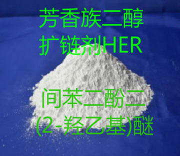 HER,間苯二酚二(2-羥乙基)醚是一種對(duì)稱(chēng)的芳香族二醇擴(kuò)鏈劑,它與MDI有著良好的配伍性。廣泛應(yīng)用于混煉型、澆注型、熱塑型的PU彈性體制品。這種材料已經(jīng)被證實(shí)能夠較大限度地維持彈性體的持久性、彈性和可塑性,并把收縮性限制到較小,沒(méi)有污染。同時(shí),該材料除具有芳香族擴(kuò)鏈的優(yōu)點(diǎn)外,還避免了HQEE在稍微降溫情況下迅速結(jié)晶現(xiàn)象的不足,提供了更好的可塑性、撕裂強(qiáng)度、初始強(qiáng)度、邵氏硬度、壓縮變形、斷裂變形以及低收縮性、抗切割、柔韌性好、防滲透性、熔點(diǎn)低
